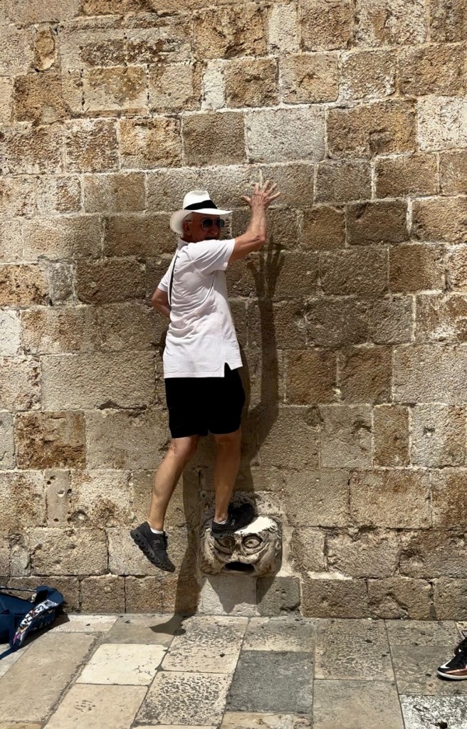 including when we had jumped up on a small step attached to the side of a building in the main street and touched the wall. The step is in fact a gargoyle head protruding from a stone wall. The head stands some half a meter above the ground, sticking out barely 15 centimetres with its top surface polished like marble and the wall above noticeably greasy from the touch of thousands of tourist hands over many years. Legend has it that if you hop onto its head, take off your shirt while still standing facing the wall, luck in love will follow you. I couldn’t resist jumping up again, so I got Pauline to video me doing somewhat of a repeat as a nostalgic tribute to those wonderful days that now felt like yesterday. Although I didn’t take my shirt off this time I must have previously as I have been very lucky indeed having met Pauline on that trip.