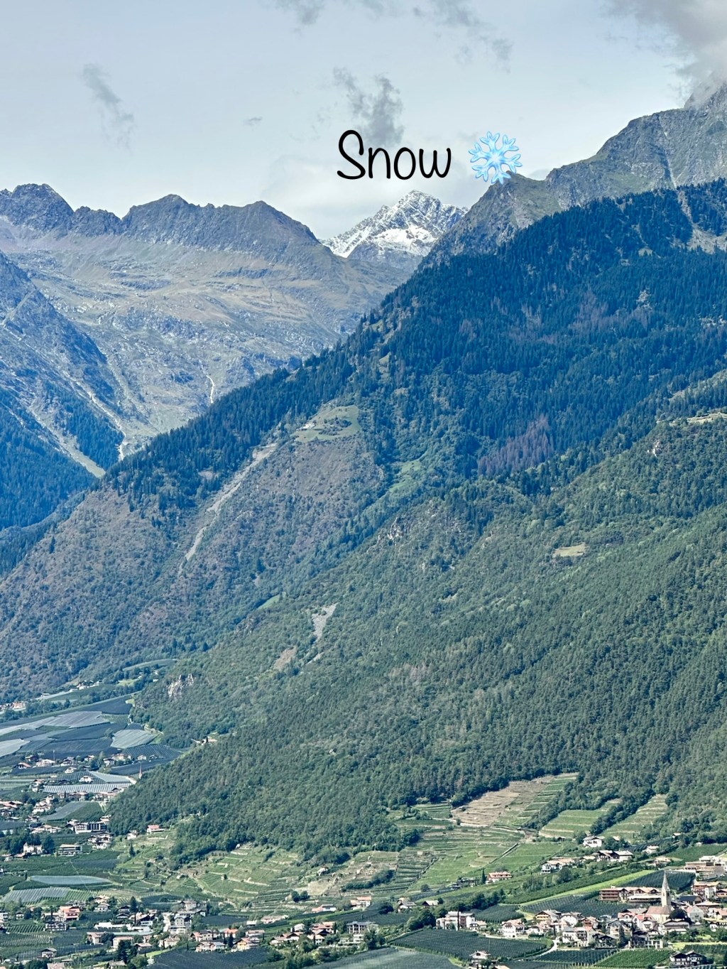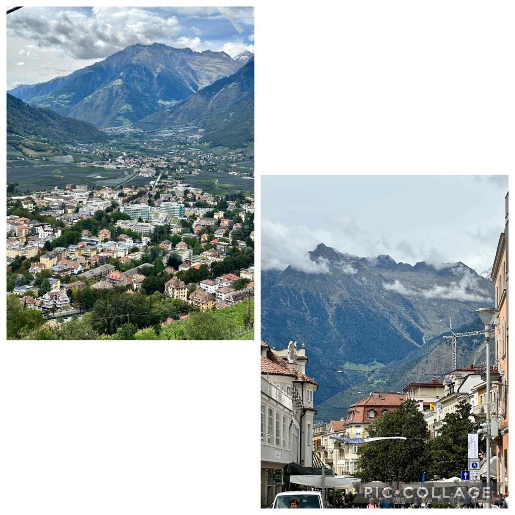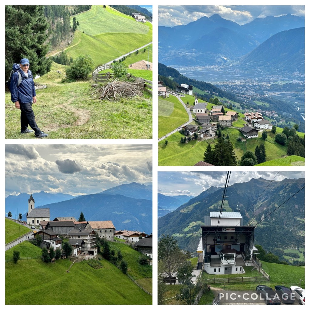 When we arrived at the top station, we were surprised to find upmarket hotels and chalets with unbelievable views overlooking the valley below and with snow still on the mountain tops in the distance. We also noted a road that you could drive up from Merano rather than catch the chairlift with the town serviced by a bus route – that may have been a better option in hindsight we thought to ourseleves.