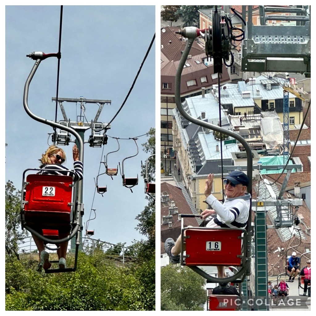 We had read that you could catch the chairlift Meran-Dorf Tirol up to the village of Tirolo (at a height of 594m) and walk to the Castle Tyrol (from which the whole Tyrol region got its name) so we headed in that direction. The chairlift turned out to be a single person open chair style dating back to the 1940’s that climbed the mountain totally exposed to the elements.