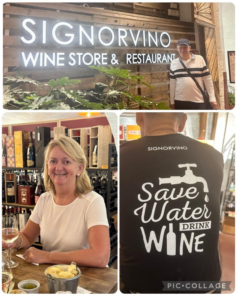On our return to Merano we made straight for Signorvino,a wine store and restaurant in Laubengasse Street that we had noticed earlier in the day for a late lunch and a recovery wine prior to heading back to Saltaus – the staff there wear these amazing T-shirts which we loved and will get something similar made-up for ouselves when we get back to Oz.