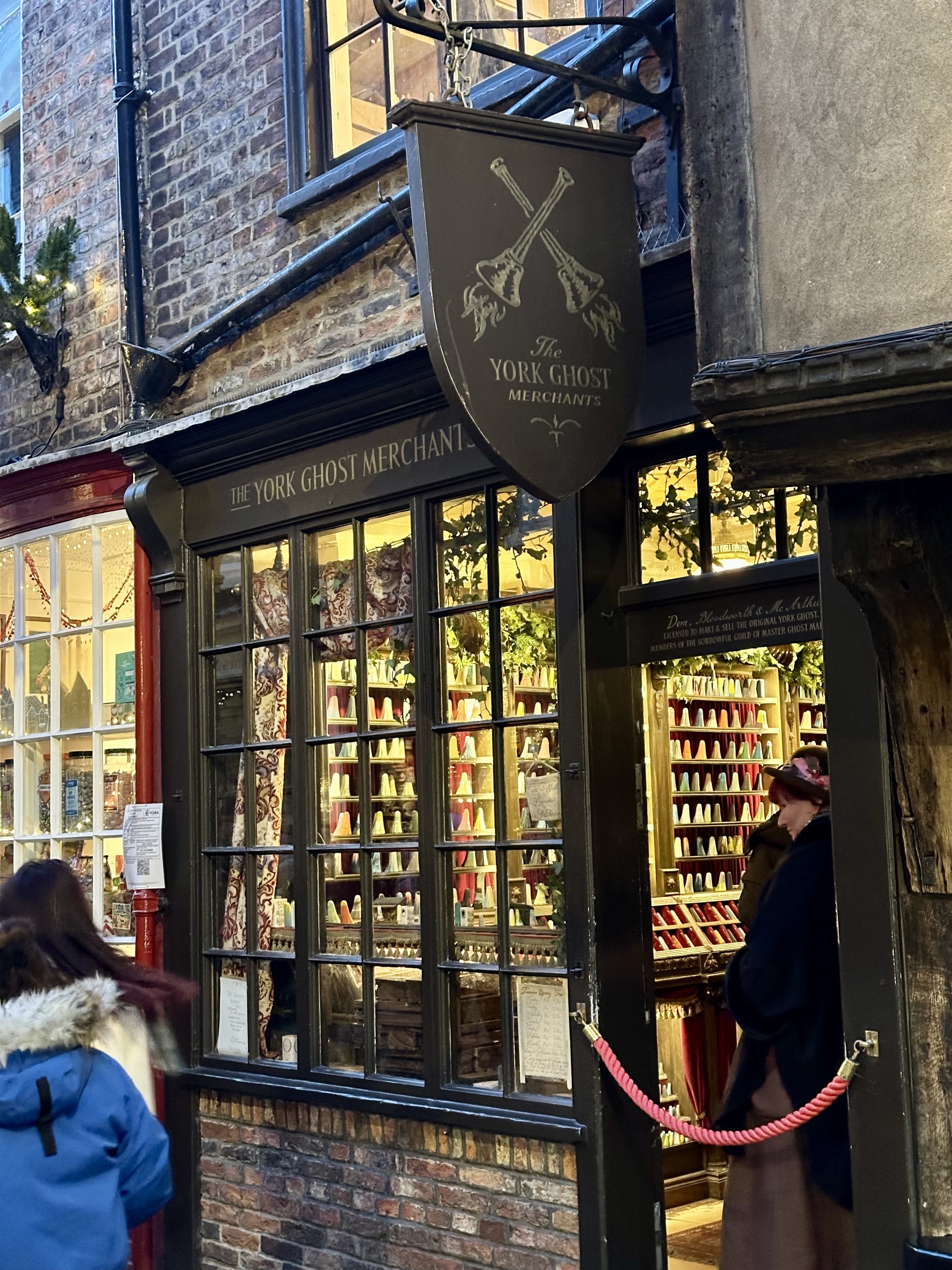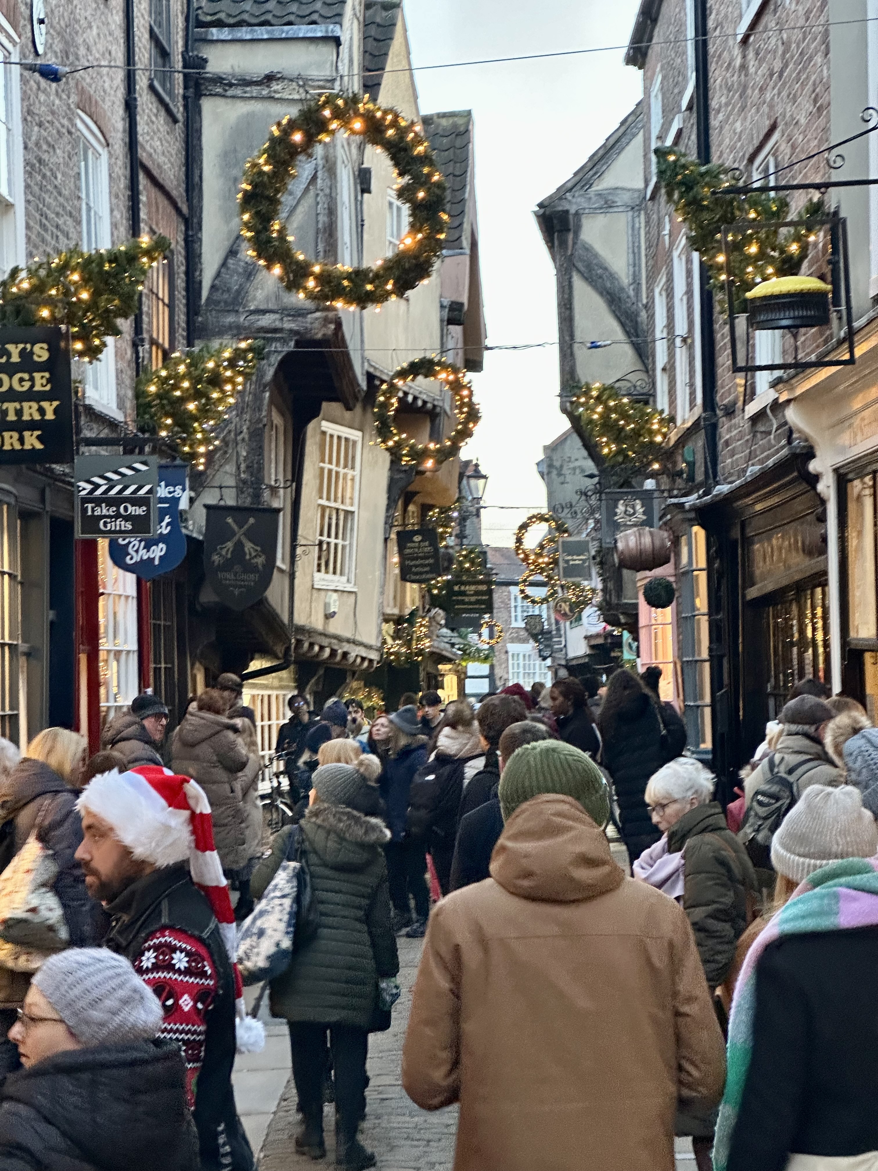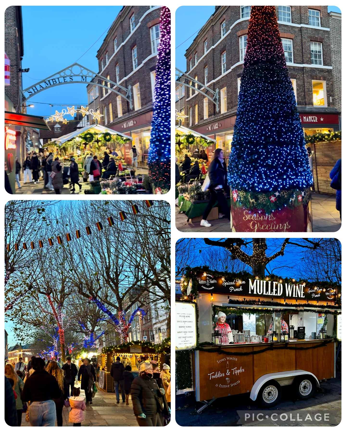 York is a city where you could easily spend at least a week exploring and appreciating this intriguing city but being there for only a few days and the weather cold and wet we concentrated our time around the Shambles Market area where all the Christmas activities were centred to really enjoy the Christmas atmosphere. The Shambles is only a very small street, so it was crowded as expected but the odd shaped shops filled with Harry Potter memorabilia, “The Shop that Must Not Be Named” and “The York Ghost Merchants Shop” make it a must see if your visiting York. As night fell the lights all came on along the main streets and provided a wonderful Christmas atmosphere with drink huts set up offering Mulled Wine or more interestingly Hot Chocolate with Baileys. We could not bring ourselves to try the hot chocolate though as it sounded just too rich. What was disappointing was that we expected to see the huts being filled with all things Christmas but instead found mainly food and general paraphernalia i.e. normal markets at Christmas time rather than Christmas markets.