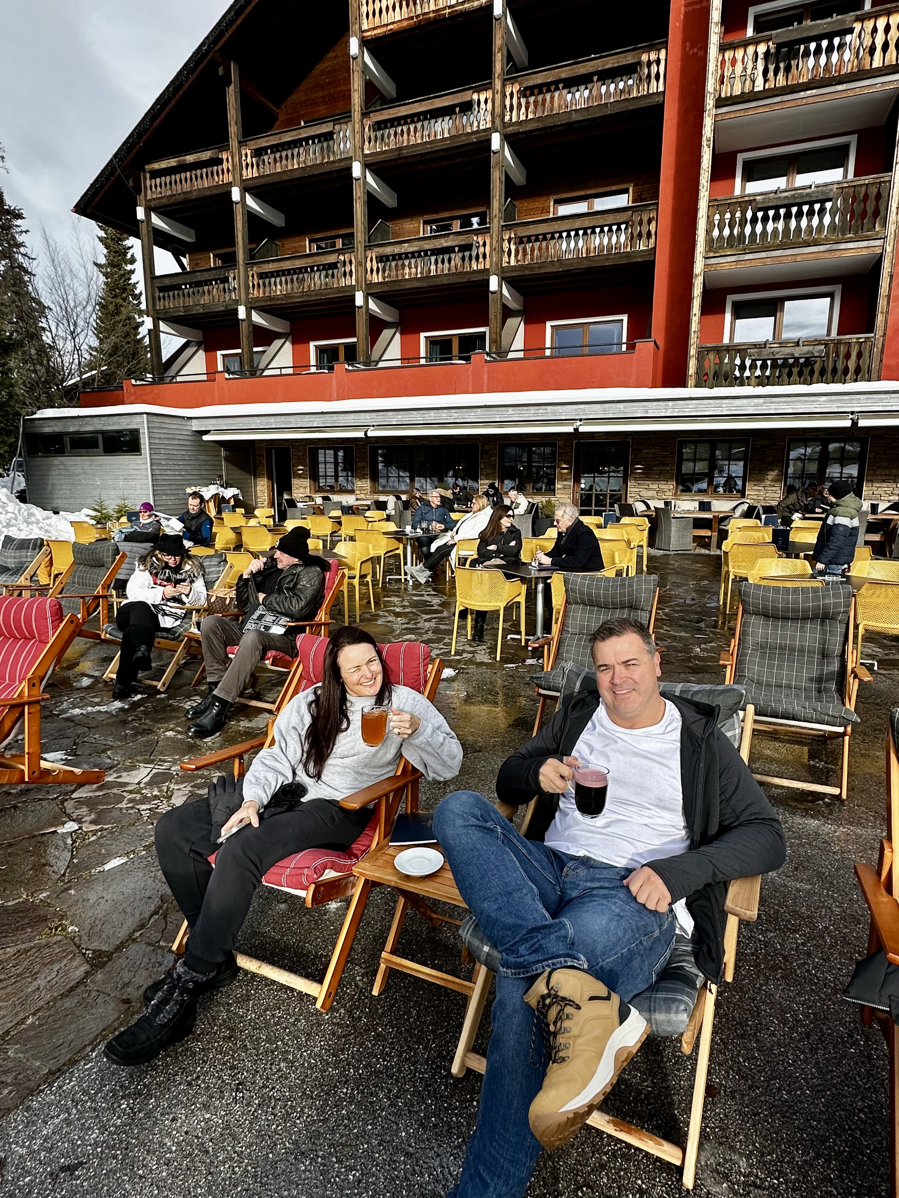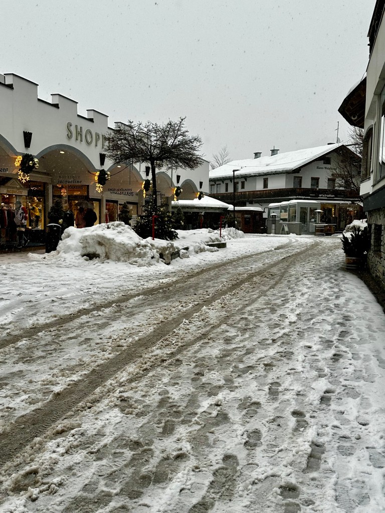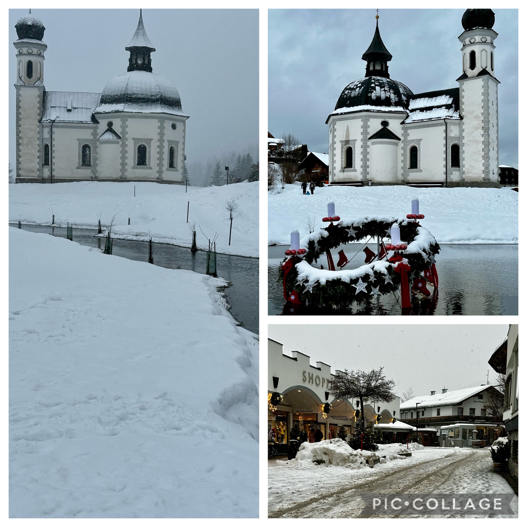 After all that exhausting work it was time for a warming drink, so we chose an outside restaurant overlooking the white covered slopes and the famous Chapel Seekirchl which dates to 1666 and the most famous landmark in Seefeld – what a great view to enjoy as a local watering hole.