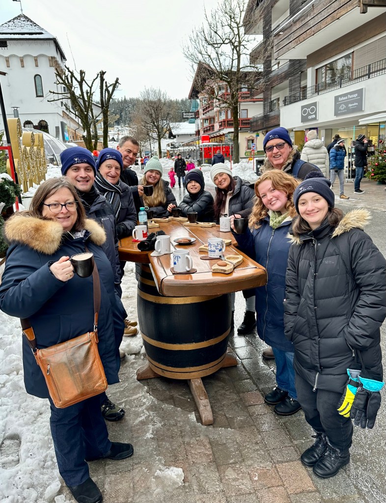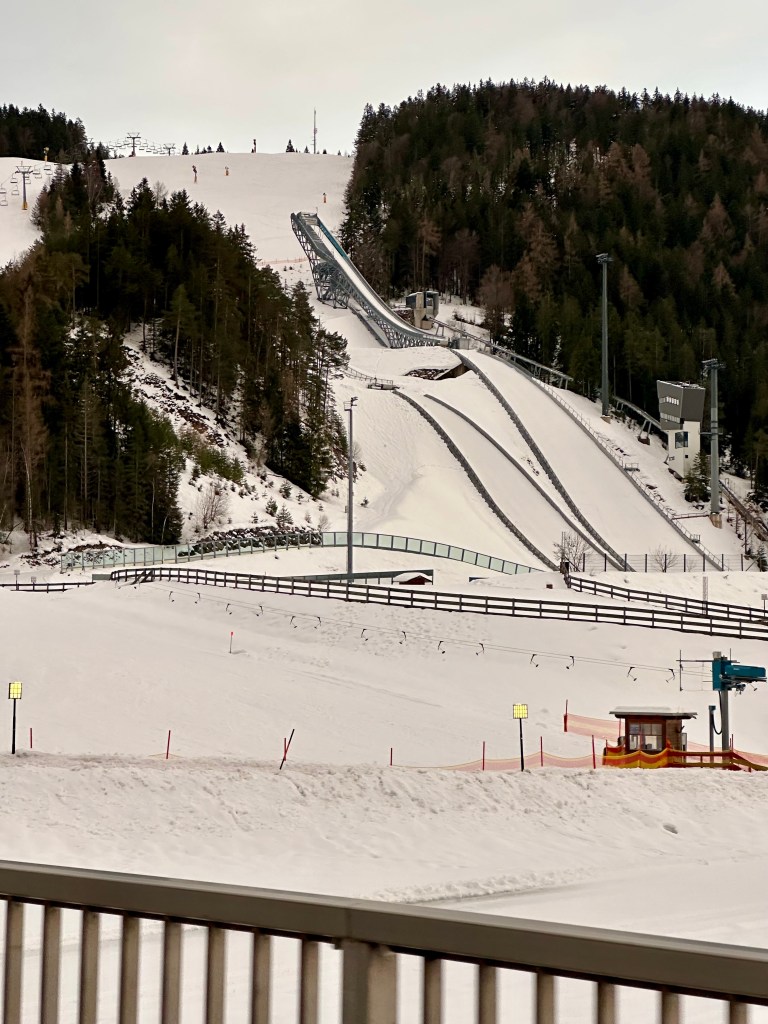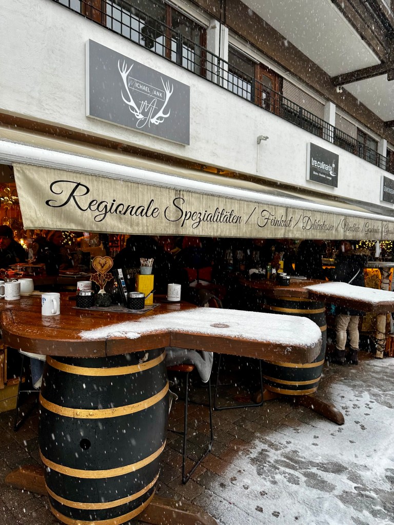 After breakfast it was off to explore the village with heavy snow falling continuously throughout the day while we strolled around. Seefeld is the quaintest Austrian village imaginable and hosted the 1964 and 1976 Winter Olympics specialising in cross country skiing and ski jumping as well as the 2012 Youth Winter Olympics. It is located 1180 meters above sea level and on the outskirts of the village cross country skiers were traversing the terrain while the ski jumping structure was still present and apparently used for events. The village was full of boutique shops but more importantly outdoor restaurants and bars where you could have a drink and embrace the wonderful scenery in all directions, no matter if it was snowing. In the market square were Christmas markets that came alive at night as a meeting place to embrace people from all around the world and have a drink that we discovered was called Apfelwein with Happiness– more on that later.