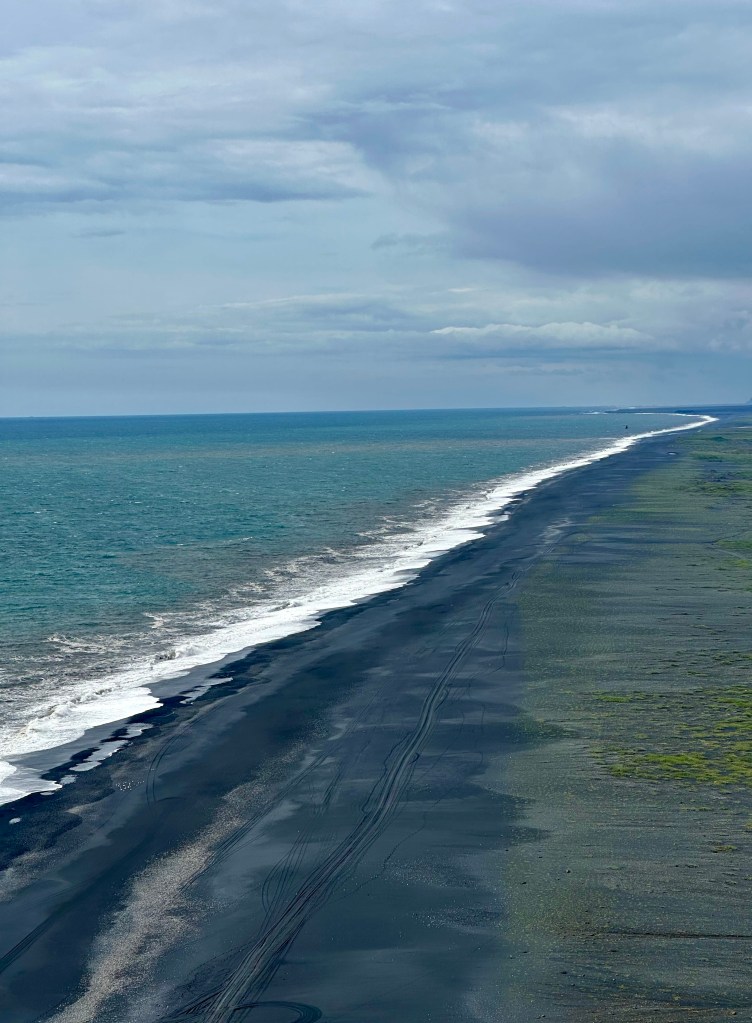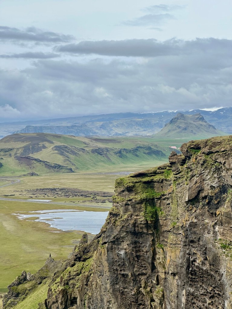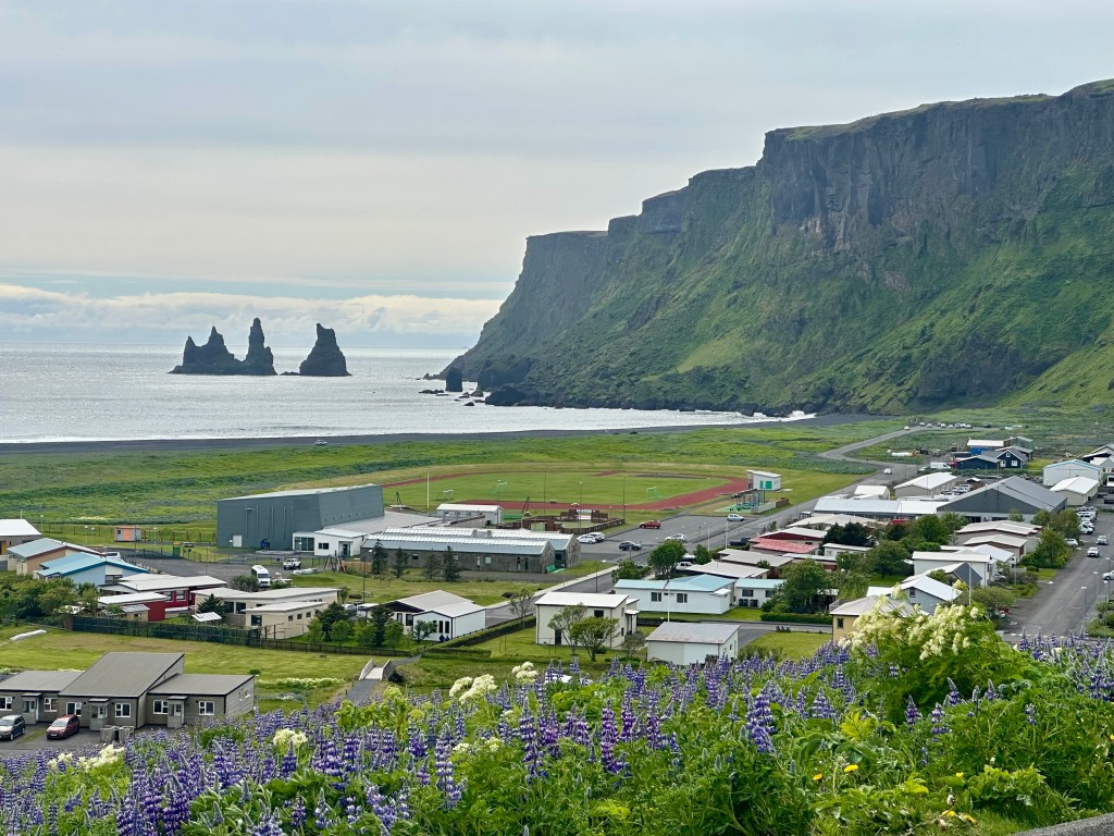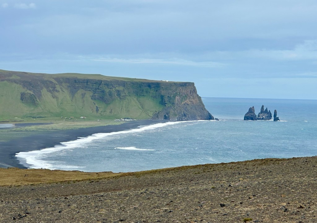 Above the town of Vik is a hill that offers stunning views of the surrounding black sand beach landscape in this area