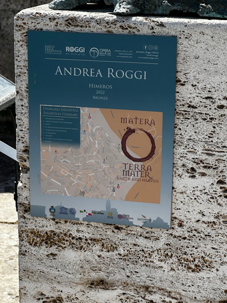 Throughout the Old Town were some amazing sculptures from an Italian artist Andrea Roggi. Curious about the artist we researched and found that Andrea is a Tuscan sculpture born in 1962 and has a Circle of Life Gallery in Cortona. He has located many of his works throughout Italy and would see more throughout Puglia and also when we arrived in Florence later in our trip – simply stunning and great to see them located in unique outdoor locations such as throughout Matera.